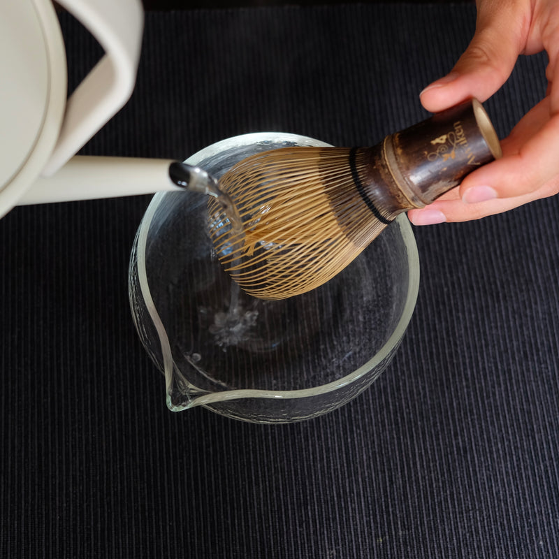- place the chasen on this whisk holder while you empty and dry the bowl with a dry cloth. You have now not only soaked the whisk, but also heated the bowl. which help the matcha to 'open up' and release more of it's aroma.