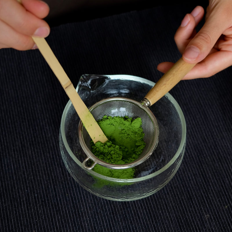 - with your bamboo spoon, scoop 2-3 scoops of matcha (3 grams) and carefully push it through the sifter with the spoon to remove any clumps.