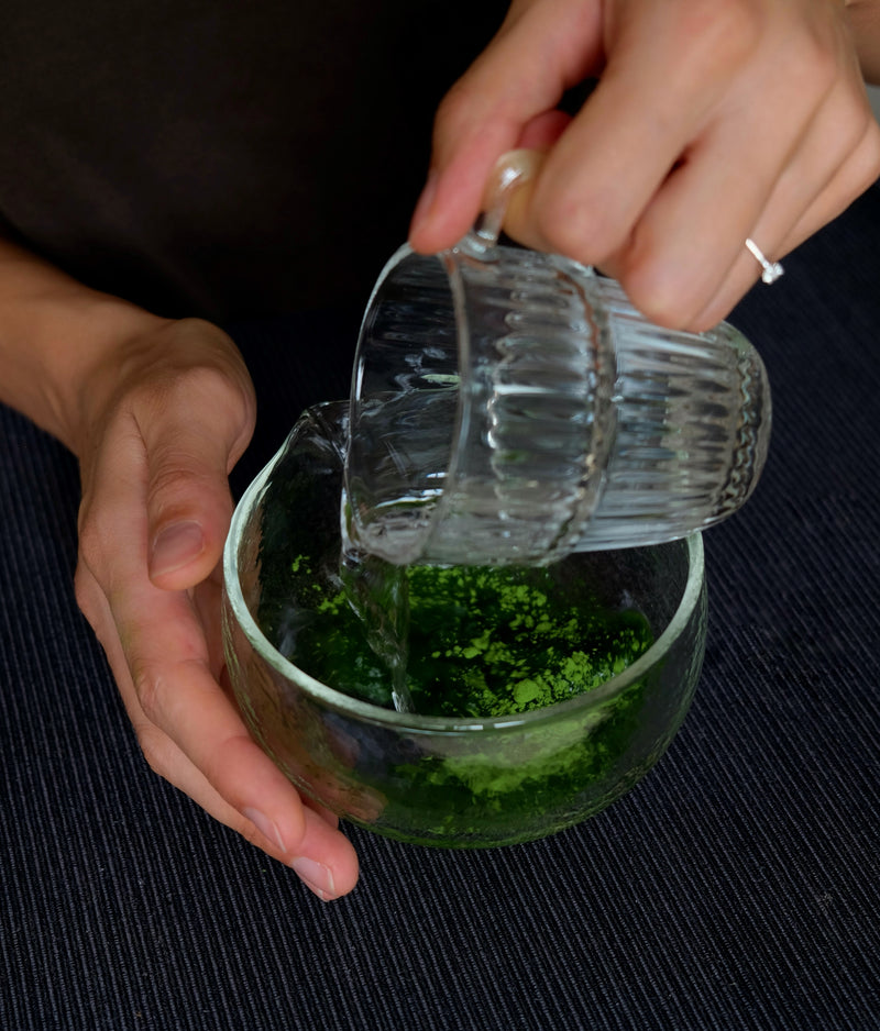 - Rimuovi gli strumenti e versa lentamente circa 60 ml d’acqua sopra il matcha.
