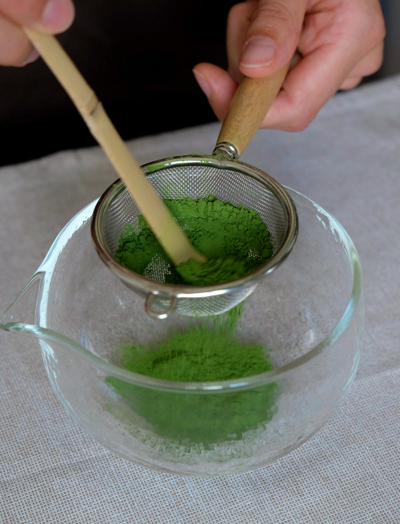 - Con il cucchiaino di bambù prendi 2-3 cucchiaini di matcha (3 g) e spingilo attraverso il setaccio per eliminare i grumi.