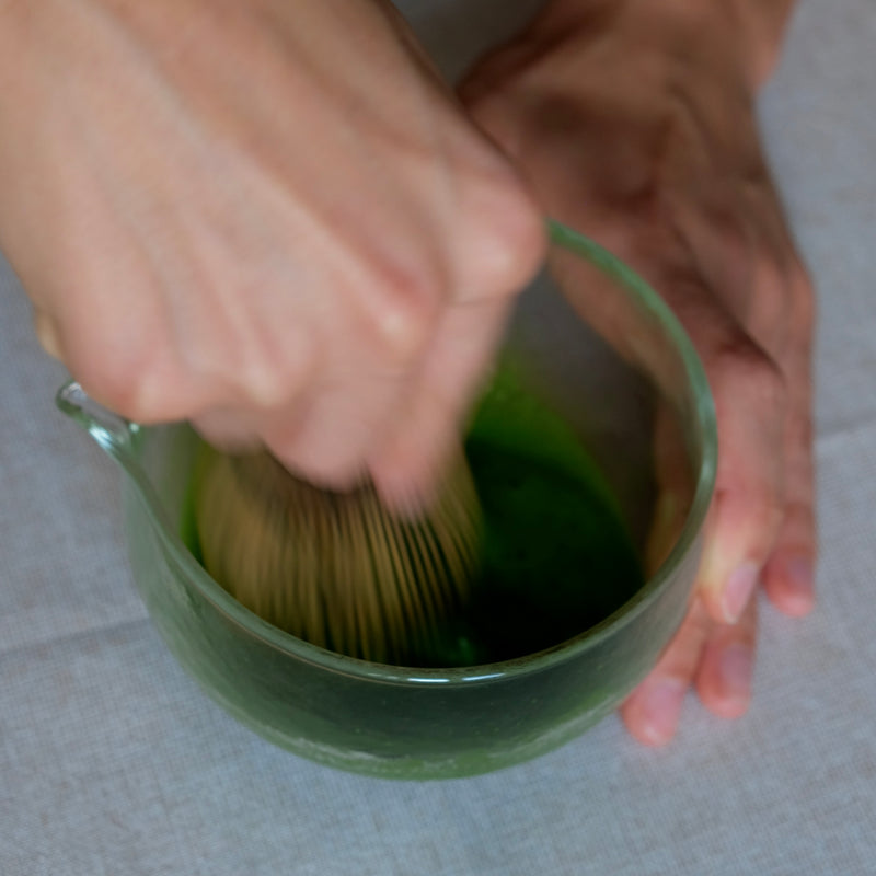 - place the chasen in the bowl, hold it in a soft and relaxed manner, move the chasen around the bowl to remove any matcha from the sides, and then continue to make a W or M motion. Try to keep a rhythm without applying too much pressure, it helps to move from your wrist. do this for 20 - 30 seconds.