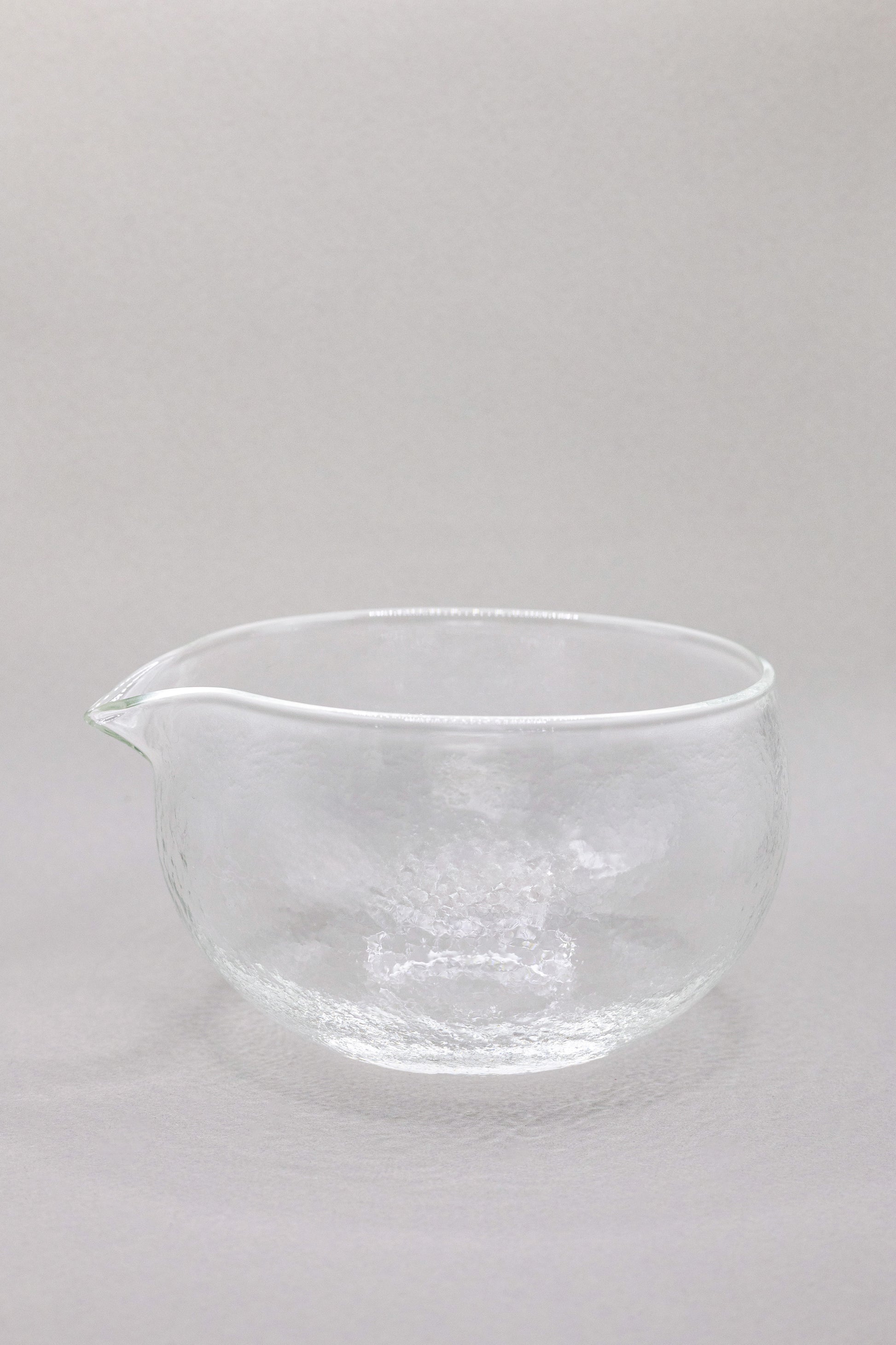 The Textured Glass Matcha Bowl with Spout brings refinement and ease to your matcha ritual. Its wide form allows space for whisking a smooth, frothy tea, while the spout offers graceful control when pouring into smaller cups.